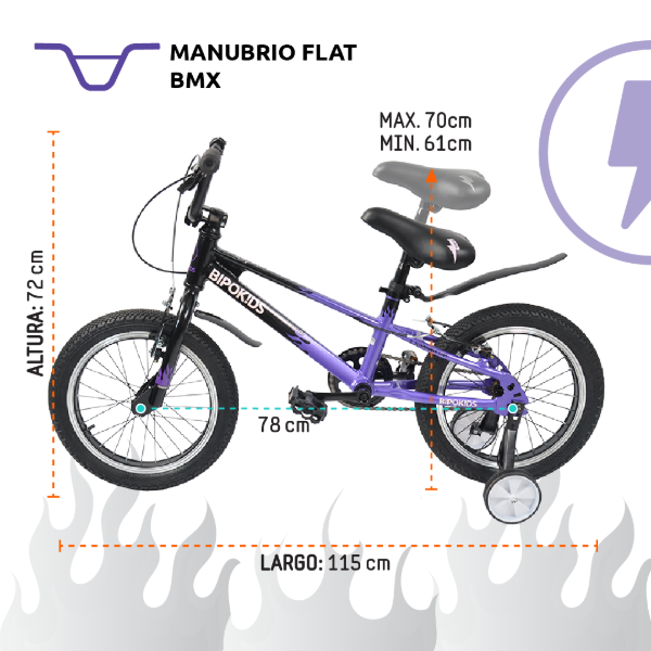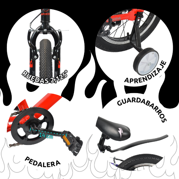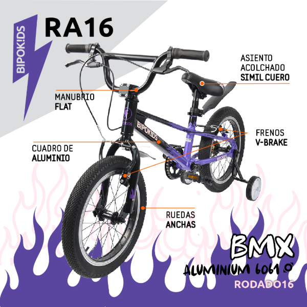 Bicicleta BIPOKIDS BMX Rodado 16 Cuadro de Aluminio Diseñada especialmente para niños a partir de 4 años, su estructura de aluminio garantiza ligereza y resistencia, permitiendo que los niños disfruten de paseos seguros y cómodos. Con un rodado de 16 pulgadas y un peso de solo 9 kg, es fácil de manejar y perfecta para aprender a montar. Equipadas con frenos V-brakes tanto en la parte delantera como trasera, esta bicicleta ofrece un control óptimo y una detención rápida, brindando tranquilidad a los padres. Además, cuenta con ruedas de entrenamiento que facilitan el aprendizaje, permitiendo que los niños se sientan seguros mientras adquieren confianza en sus habilidades. Su diseño atractivo y funcionalidad la convierten en una excelente elección para fomentar la actividad física y el disfrute al aire libre en los más jóvenes. Con un peso máximo soportado de 75 kg, esta bicicleta es adecuada para el crecimiento de los niños, acompañándolos en sus aventuras durante varios años. El asiento de cuero sintético y los pedales de plástico aseguran comodidad y durabilidad, haciendo de cada paseo una experiencia placentera. ¡¡¡¡¡¡ ATENCIÓN !!!!!!!! GARANTÍA: LA COLOCACIÓN DE LOS PEDALES ES EXCLUSIVA RESPONSABILIDAD DEL USUARIO, BAJO NINGUNA CIRCUNSTANCIA LA GARANTÍA VA A CUBRIR LA MALA COLOCACIÓN, EL BARRIDO DE LA ROSCA DEL PEDAL/ES O LA/S PALANCA/S. PEDAL DERECHO IDENTIFICADO CON LA LETRA R - ROSCA DERECHA PEDAL IZQUIERDO IDENTIFICADO CON LA LETRA L - ROSCA IZQUIERDA -IMAGEN ILUSTRATIVA, LOS ACCESORIOS PUEDEN VARIAR SEGÚN PARTIDA