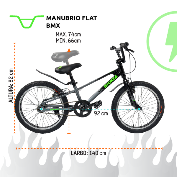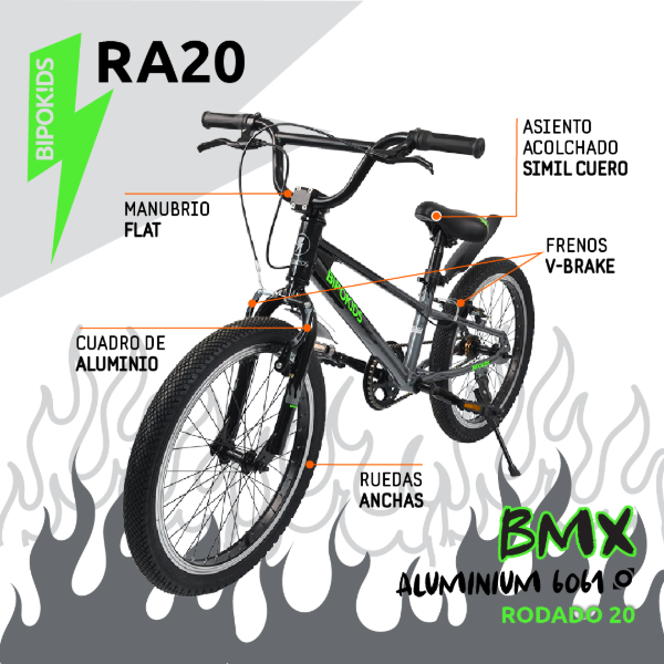Bicicleta BMX Rodado 20 Cuadro de Aluminio. Diseñada especialmente para niños a partir de 7 años, su estructura de aluminio garantiza ligereza y resistencia, permitiendo que los niños disfruten de paseos seguros y cómodos. Con un rodado de 20 pulgadas y un peso de solo 10 kg, es fácil de manejar y perfecta para aprender a montar. Equipadas con frenos V-brakes tanto en la parte delantera como trasera, esta bicicleta ofrece un control óptimo y una detención rápida, brindando tranquilidad a los padres. Su diseño atractivo y funcionalidad la convierten en una excelente elección para fomentar la actividad física y el disfrute al aire libre en los más jóvenes. Con un peso máximo soportado de 80 kg, esta bicicleta es adecuada para el crecimiento de los niños, acompañándolos en sus aventuras durante varios años. El asiento de cuero sintético y los pedales de plástico aseguran comodidad y durabilidad, haciendo de cada paseo una experiencia placentera. Altura de asiento: mín. 66 cm / máx. 74 cm Distancia entre ejes: 92 cm Altura del manubrio: 82 cm ¡¡¡¡¡¡ ATENCIÓN !!!!!!!! GARANTÍA: LA COLOCACIÓN DE LOS PEDALES ES EXCLUSIVA RESPONSABILIDAD DEL USUARIO, BAJO NINGUNA CIRCUNSTANCIA LA GARANTÍA VA A CUBRIR LA MALA COLOCACIÓN, EL BARRIDO DE LA ROSCA DEL PEDAL/ES O LA/S PALANCA/S. PEDAL DERECHO IDENTIFICADO CON LA LETRA R - ROSCA DERECHA PEDAL IZQUIERDO IDENTIFICADO CON LA LETRA L - ROSCA IZQUIERDA -IMAGEN ILUSTRATIVA, LOS ACCESORIOS PUEDEN VARIAR SEGÚN PARTIDA EL ENSAMBLADO Y REGULADO FINAL LO DEBE HACER UN BICICLETERO, LA GARANTÍA NO CUBRE REGULADO Y PUESTA A PUNTO DE LAS MISMAS.