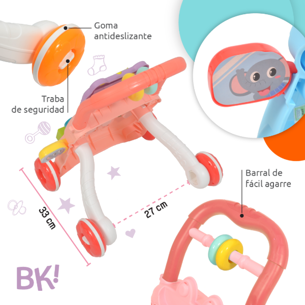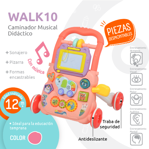 El WALK 10 es el compañero ideal para que tu bebé explore y se divierta mientras desarrolla sus habilidades motoras. Con un diseño divertido y funcional, este caminador viene con un pizarrón mágico extraíble para que tu pequeño se divierta dibujando y aprendiendo.