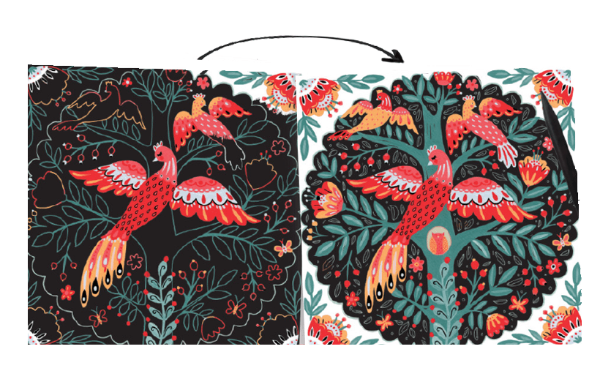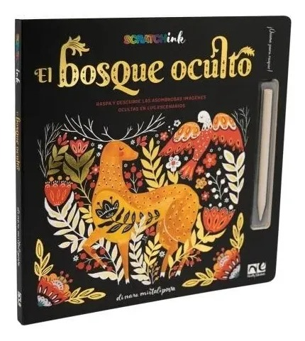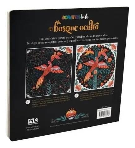 Las páginas de este libro están cubiertas con tinta negra para raspar con una pluma y revelar el diseño que se esconde debajo. Las ilustraciones inspiradas en la naturaleza se pueden personalizar dejando una parte de su superficie en color y otra en negro.